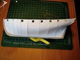 Oba warianty mają plusy dodatnie i ujemne. W wersji "na styk" łatwiej jest zachować "idealnie" gładkie przejście pomiędzy częściami, ale trzeba dokładnie ukształtować nadburcie i "kleić trza umić". W wersji drugiej najpierw przykleiłem ostatnią plankę (by spasować otwory ambrazur) i dopiero potem wkleiłem przedostatnią, której obie krawędzie są zakryte listwami. Samo spasowanie ambrazur nie było takie łatwe, pewnie dlatego, że pojawiły się drobne przesunięcia przy klejeniu po raz drugi poszycia poprzecznego, które zresztą jak widać na zdjęciu powyżej, było z prawej burty. Przeniosłem ołówkiem linie przebiegu planek, ale pewnie i tak trochę "nakrzywiłem".