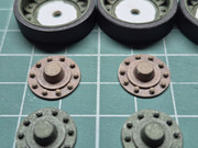 Potem było już z górki - użebrowanie i ośrubowanie koła. Tutaj zauważyłem iż nadruki śrub są nieco przesunięte na pierścieniu. Zanim przykleiłem nakrętki, nakleiłem najpierw krążki imitujące podkładki. Pozwoliły one nieco również ukryć imperfekcje w nadruku śrub.